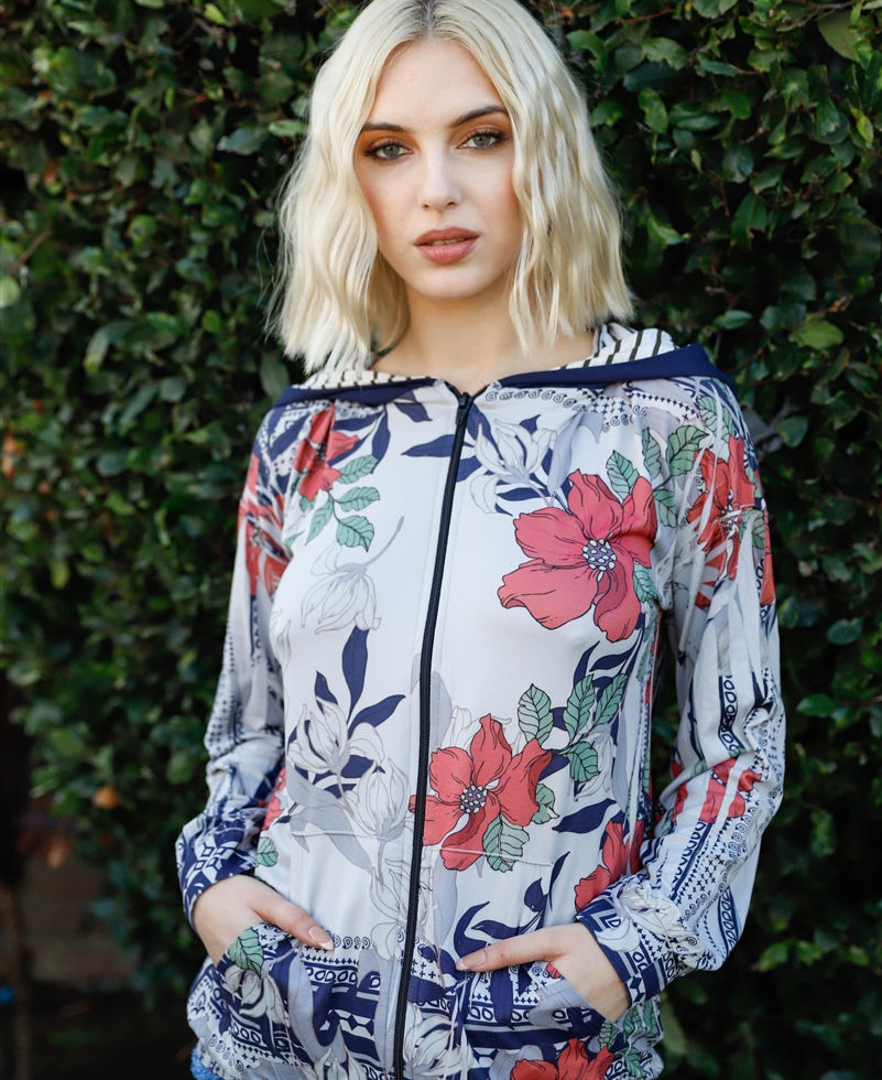 Experience the perfect blend of comfort and style with our Navy Rust Flower Print Zip-up Contrast Striped Hood Sweater. The unique design, vibrant color combination, and made-in-the-U.S.A craftsmanship make it a standout choice.