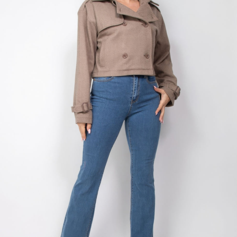 Enhance your wardrobe with our Notch Buckled Sleeve Crop Trench Coat in Camel. Add it to your cart now and experience timeless style with a modern twist!