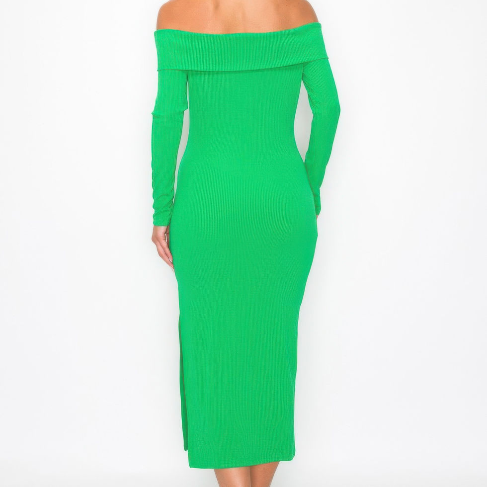 Embrace a bold and elegant look with our Off-Shoulder Rib Midi Dress in Green. This ribbed-knit dress offers the perfect balance of sophistication and modern flair, featuring long sleeves, a daring side slit, and a bodycon silhouette that beautifully accentuates your curves.