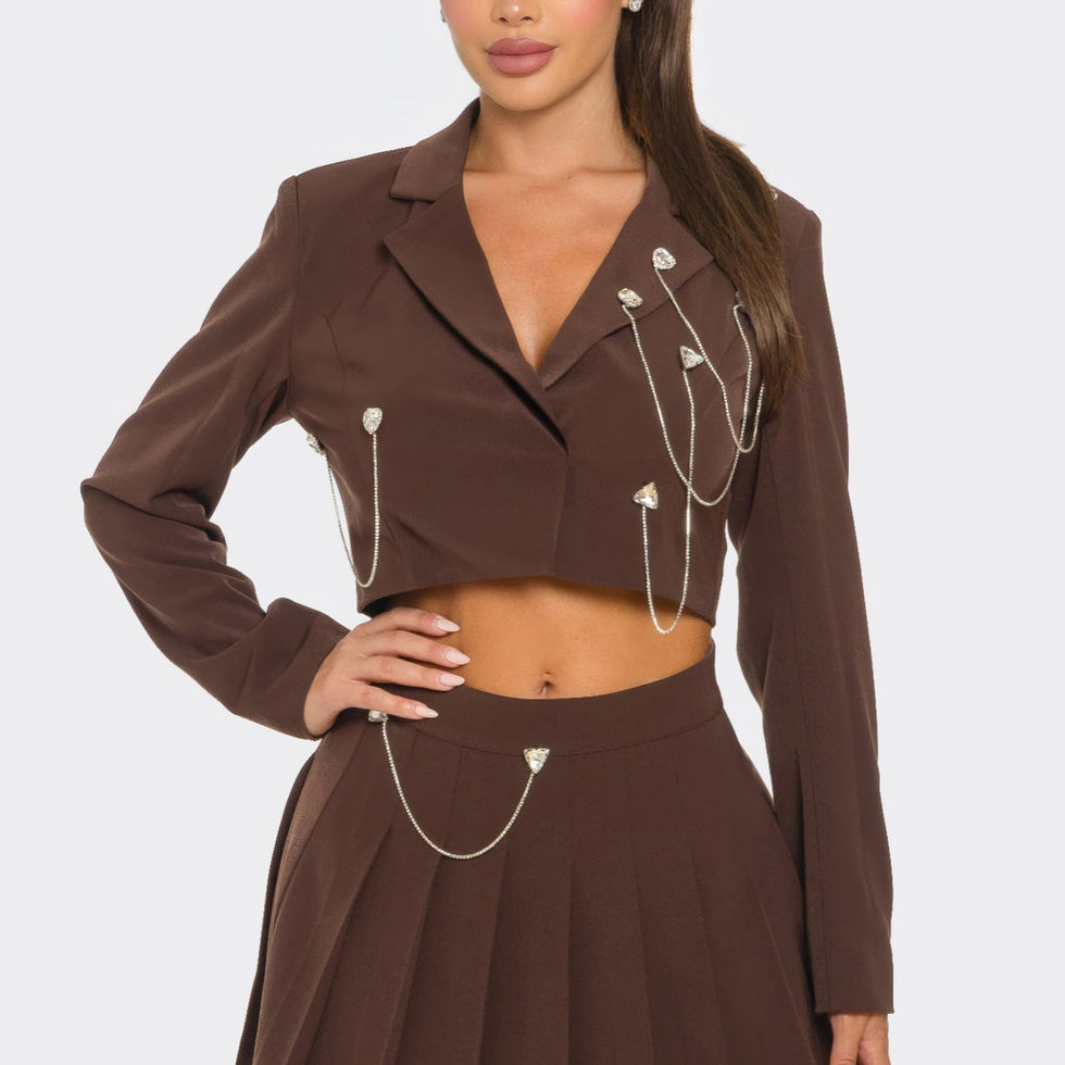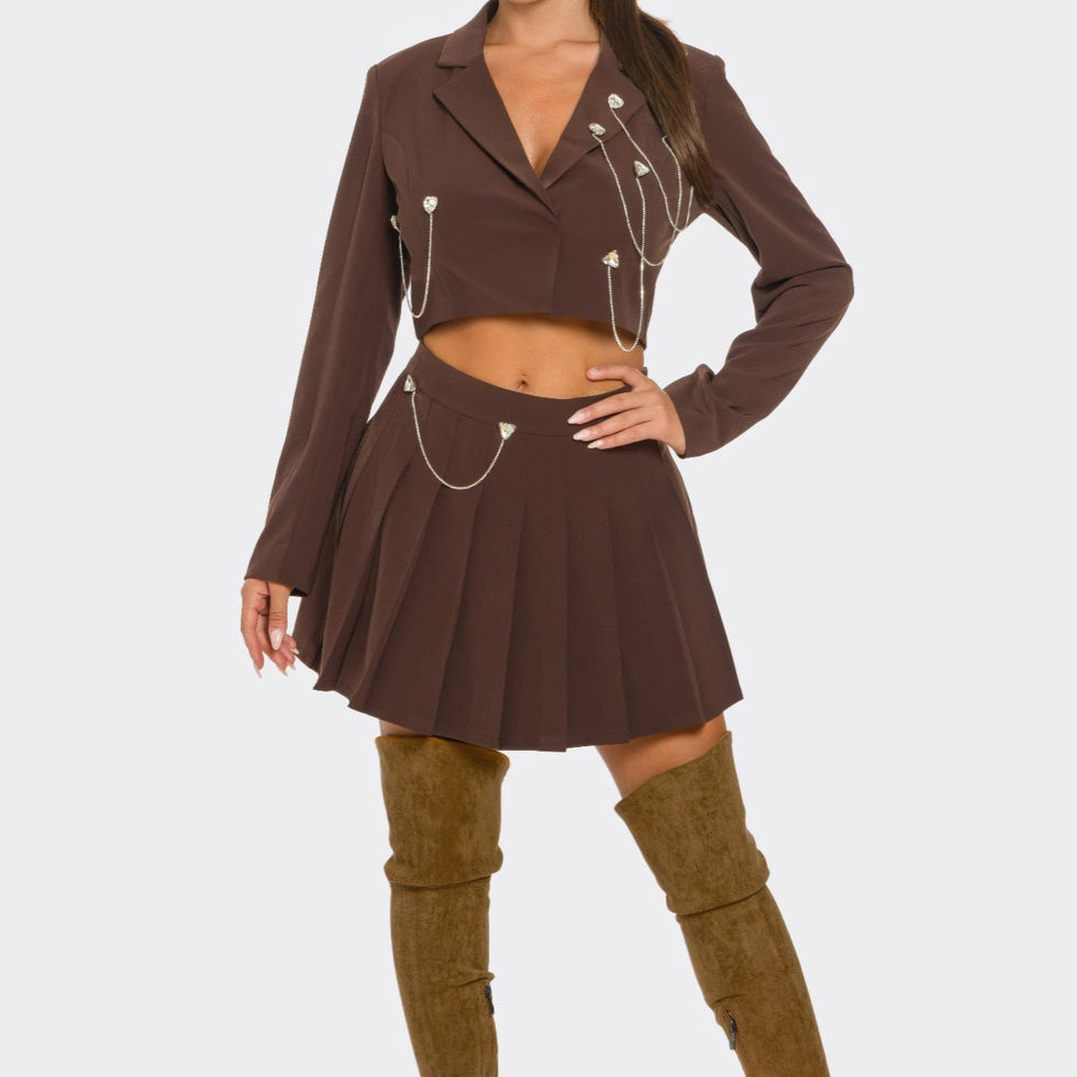 Why Choose Pleated Skirt Set This set stands out for its perfect blend of elegance and fashion-forward details. The rhinestones and chain embellishments on the pleated skirt add a distinctive flair, while the double-lined top offers a flattering and secure fit. The Chocolate color offers a rich and timeless hue that complements a range of accessories and occasions.