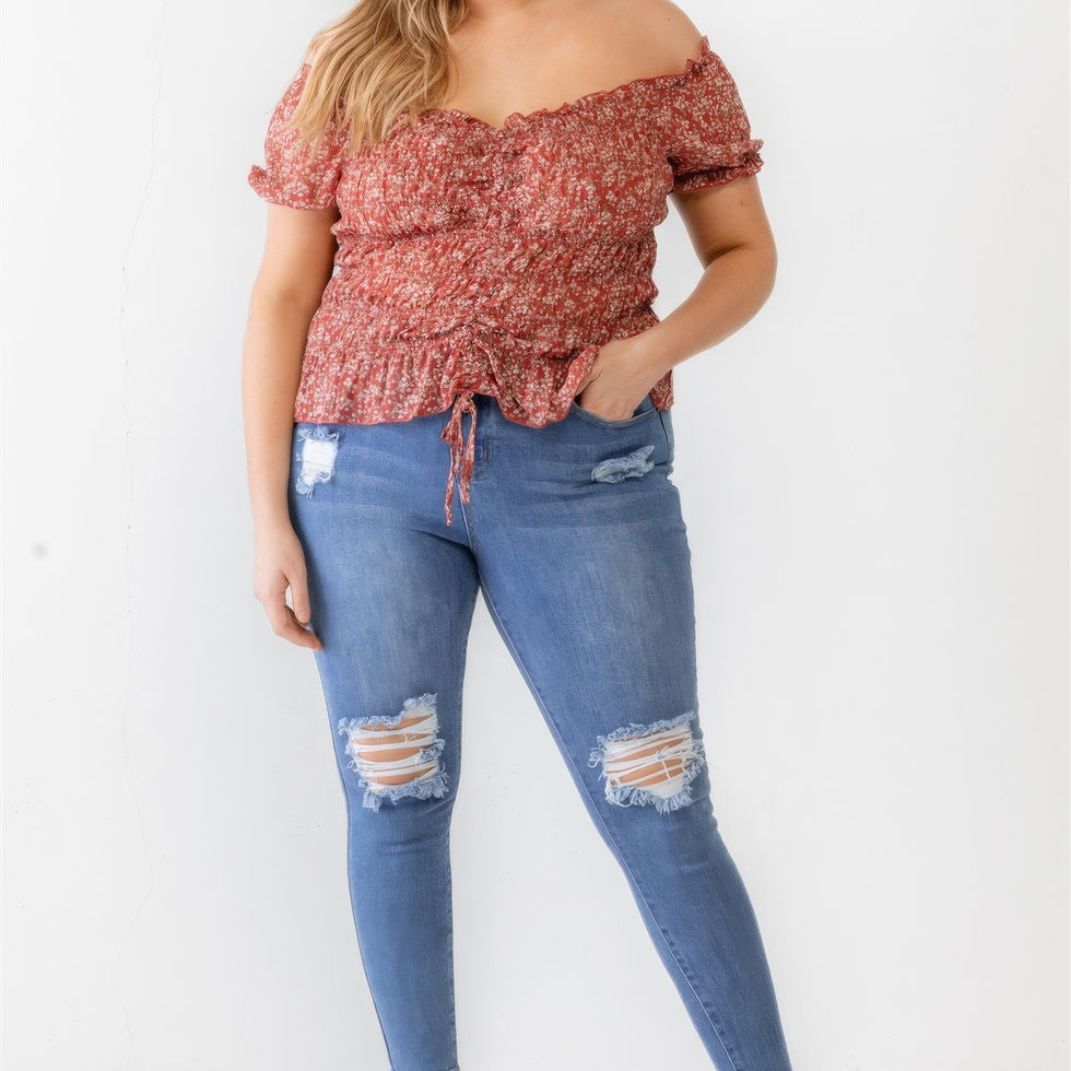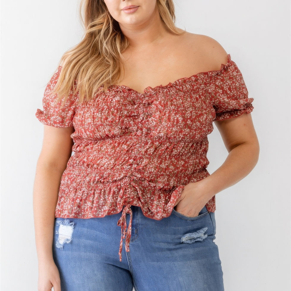 Revitalize your wardrobe with our Plus Floral Chiffon Ruched Smocked Off-the-Shoulder Top—a cute and girlish addition to your collection. Crafted from chiffon material, this top features a charming floral print, ruffle details, smocked bodice, front ruched detail with an adjustable drawstring, and an off-the-shoulder silhouette for a stylish and trendy look.