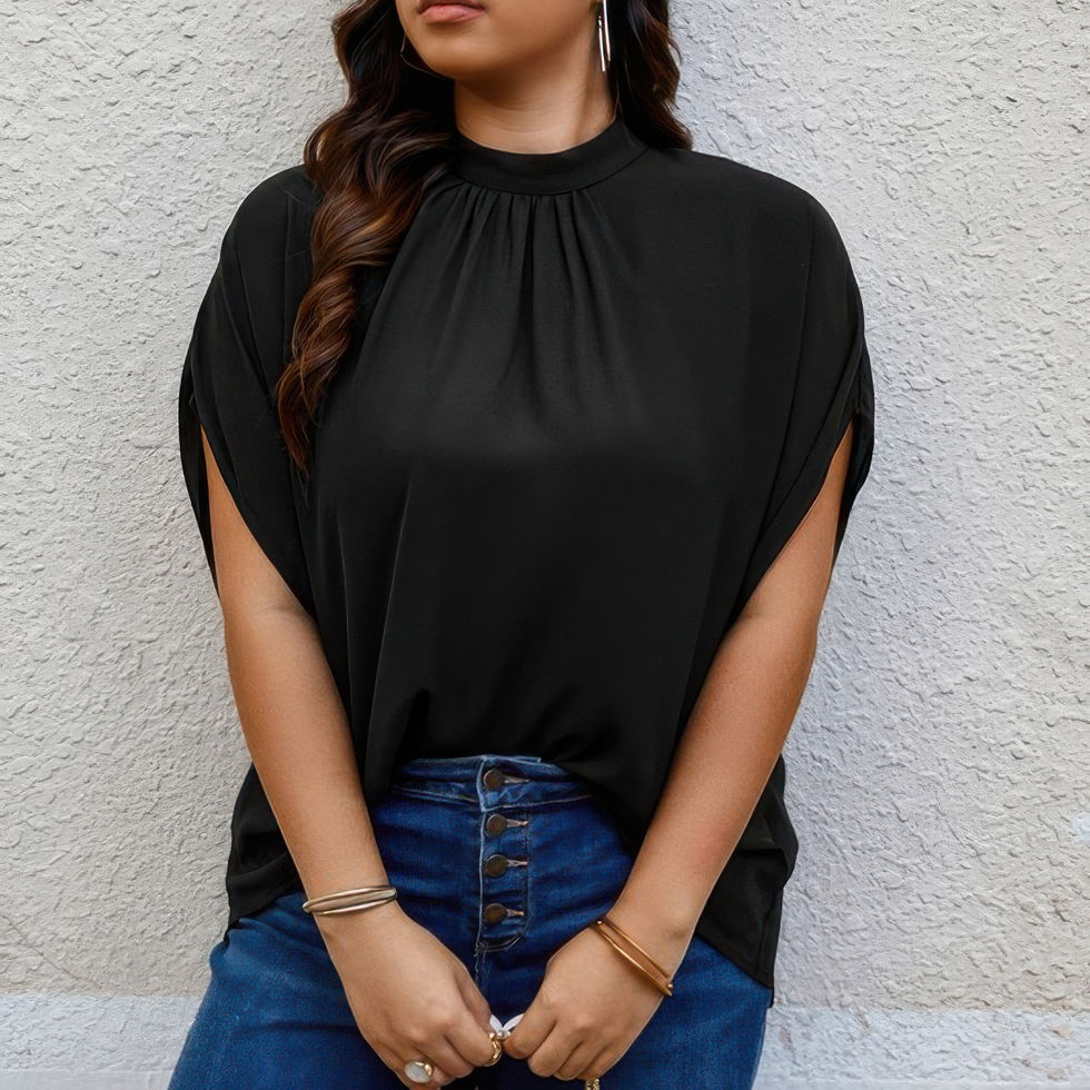 Elevate your everyday style with this plus-size mock neck tunic top, designed with dramatic batwing sleeves for a bold, modern silhouette. The relaxed fit and tunic length offer comfortable coverage, while the soft, stretchy fabric moves effortlessly with you. A mock neckline adds a sophisticated edge, making this top easy to dress up or down. Whether paired with leggings, denim, or tailored pants, it brings effortless chic to your wardrobe. Perfect for workdays, weekends, or travel, this versatile piece is as flattering as it is comfortable.