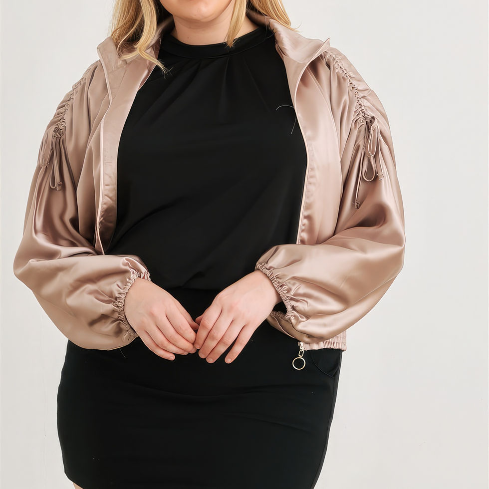Introducing our Plus Satin Zip-up Ruched Long Sleeve Cropped Bomber Jacket—a stylish and cozy addition designed to elevate your fashion game. Crafted with a perfect blend of comfort and trendiness, this jacket is a must-have for your casual and cute wardrobe.