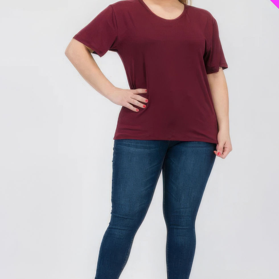 Add our Plus Size Basic Short Sleeve T-shirt in Burgundy to your collection today for a blend of comfort, style, and effortless elegance!