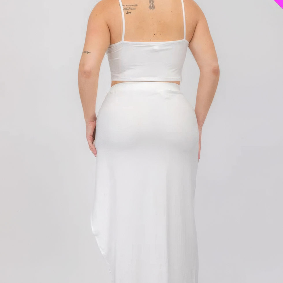 This set stands out with its unique design elements and comfortable fit, providing both style and ease. The crop cami top and split thigh maxi skirt add a touch of sophistication, while the classic white color enhances its fashionable appeal.