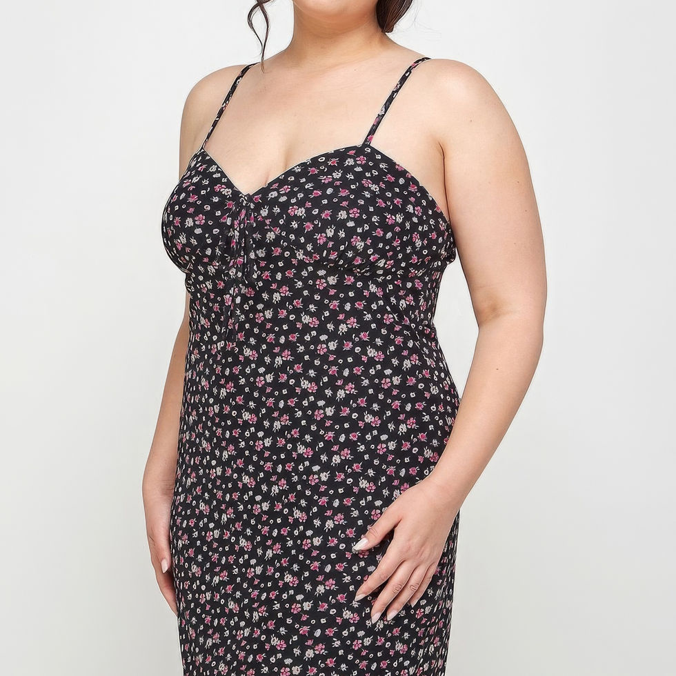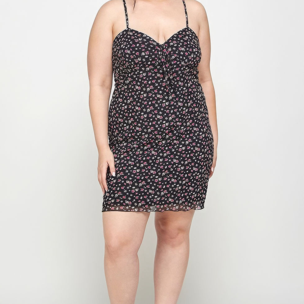 Elevate your wardrobe with our Plus Size Ditsy Floral Print on Mesh Fabric Cami Dress in the classic Black hue. This enchanting and comfortable piece is thoughtfully designed for plus sizes, offering a stylish and feminine look that embraces your curves.