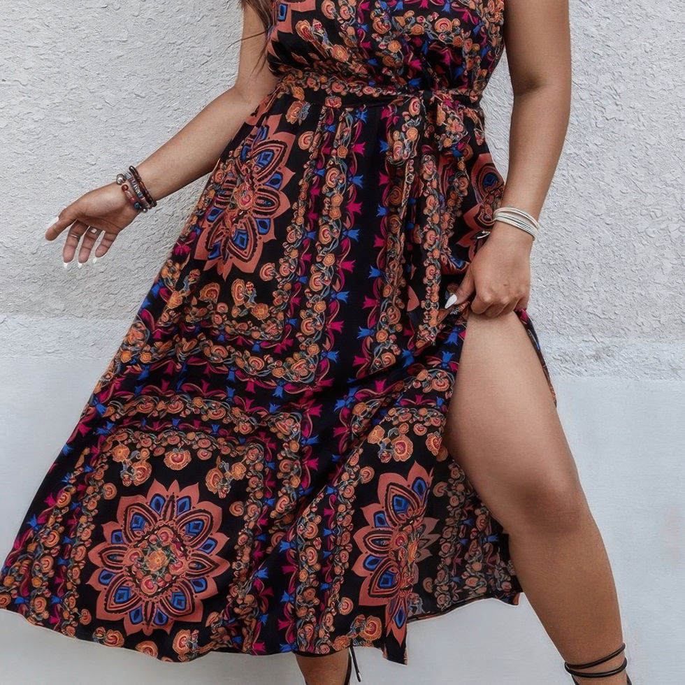 Breezy and effortlessly bohemian, this plus-size cami dress features a flowing long silhouette and a soft floral print. Adjustable cami straps and a belted waist offer a flattering, customizable fit, while the lightweight viscose fabric keeps it breathable and comfortable. Perfect for vacations, casual days, or outdoor events, this dress blends relaxed style with easy femininity.