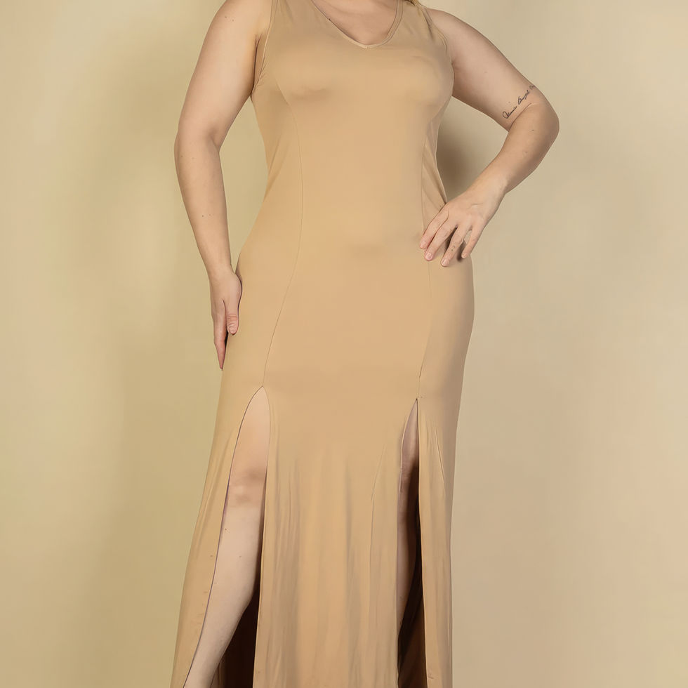 Elevate your style with our Plus Size Light Taupe Plunge Neck Thigh Split Maxi Dress. Add it to your cart now for the perfect blend of elegance and comfort!