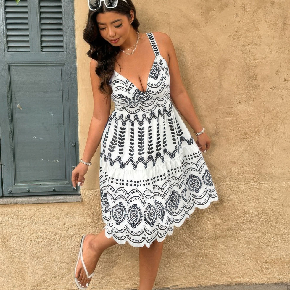 Step into sunny days with confidence in this plus-size sleeveless dress, featuring a flattering V-neckline and a vibrant all-over print. Designed with a tailored fit and made from a soft, stretch-woven fabric, it combines style and comfort for any casual occasion. The sleeveless cut keeps it cool and breathable, while the eye-catching print adds a playful, polished touch. Whether you're heading out on vacation, meeting friends, or enjoying a relaxed day outdoors, this dress delivers effortless elegance and everyday versatility.