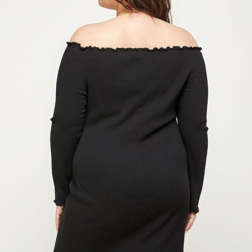 Make a fashion statement with our Plus Size Solid Smocked Off Shoulder Dress in Black. Add it to your cart now and embrace your curves with confidence!