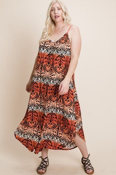 Experience the perfect blend of comfort and style with our Plus Size Tie Dye Ombre Damask Print Anna Print Cami Maxi Dress. The attention-grabbing print, adjustable features, and functional design set it apart, making it a must-have in your wardrobe.