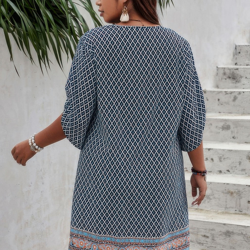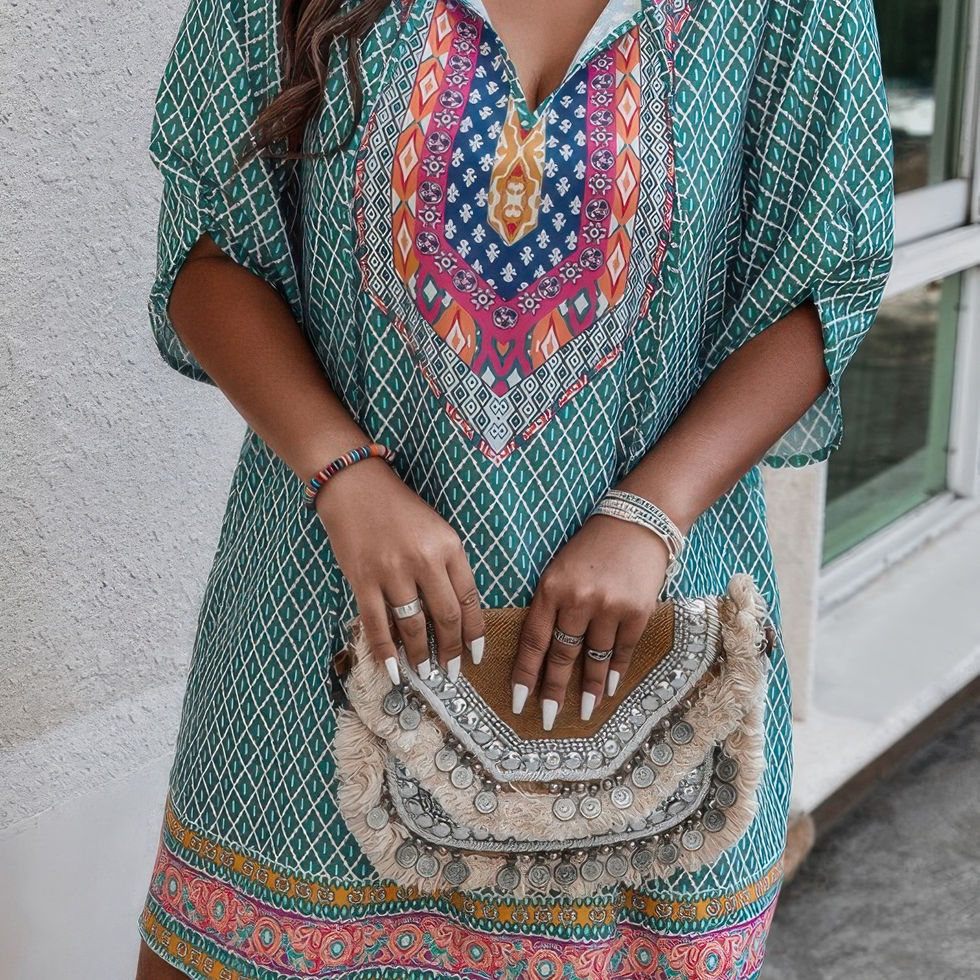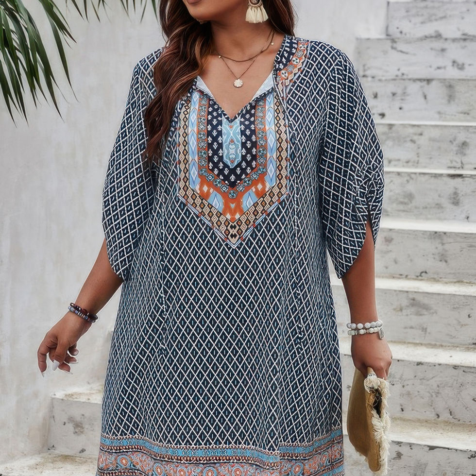 Plus Size V Neck Printed Loose Fit Midi Dress