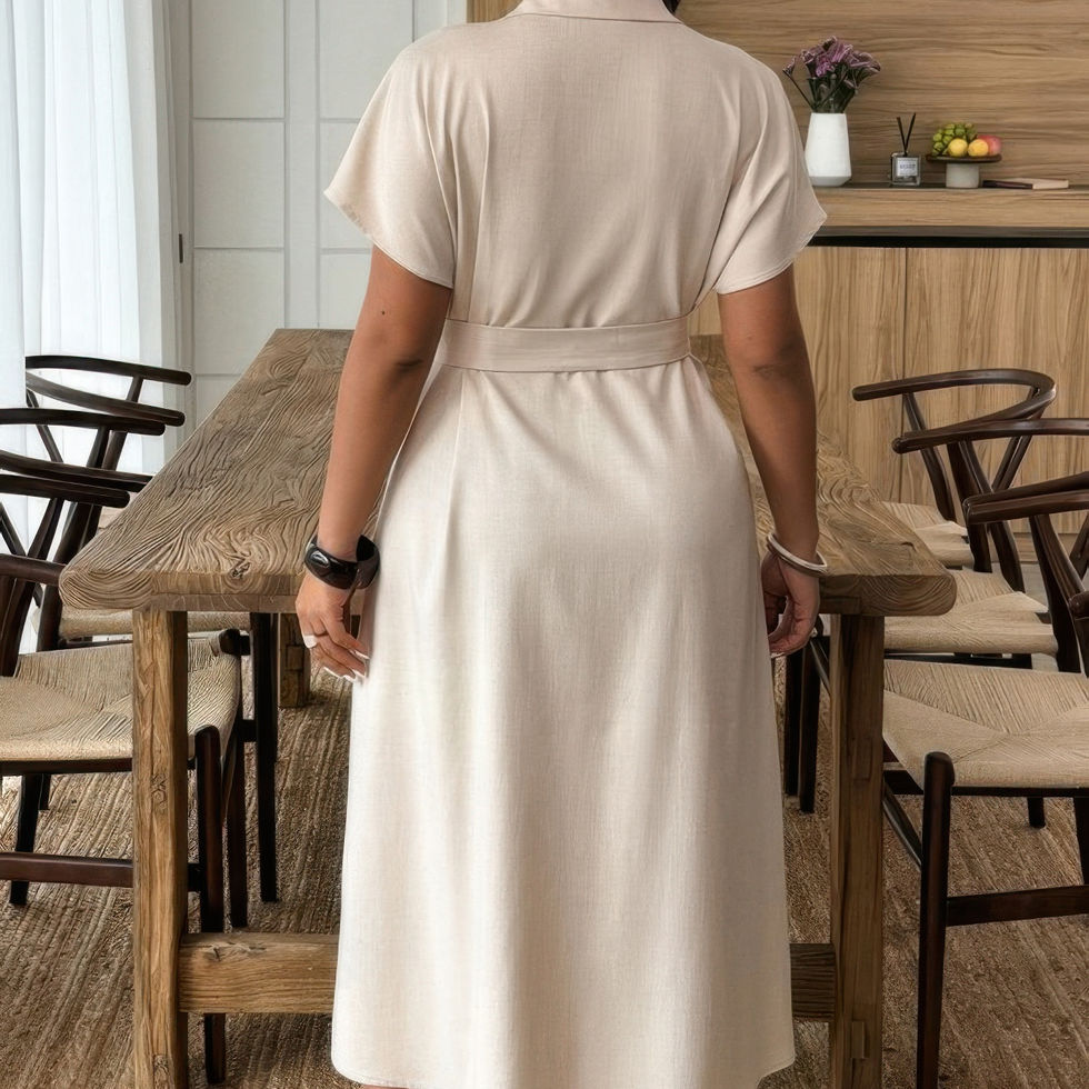Polished yet effortlessly wearable, this plus-size solid shirt dress brings structure and style together in one sleek silhouette. Featuring a classic button-down front and a coordinating belt to define the waist, it offers a straight cut that flatters without feeling restrictive. Crafted from a soft, stretchy blend of polyester and elastane, it delivers all-day comfort and versatility. The minimalist design makes it easy to dress up or down, whether you're headed to brunch, the office, or a weekend outing. Timeless and tailored, it's a wardrobe essential you'll reach for again and again.