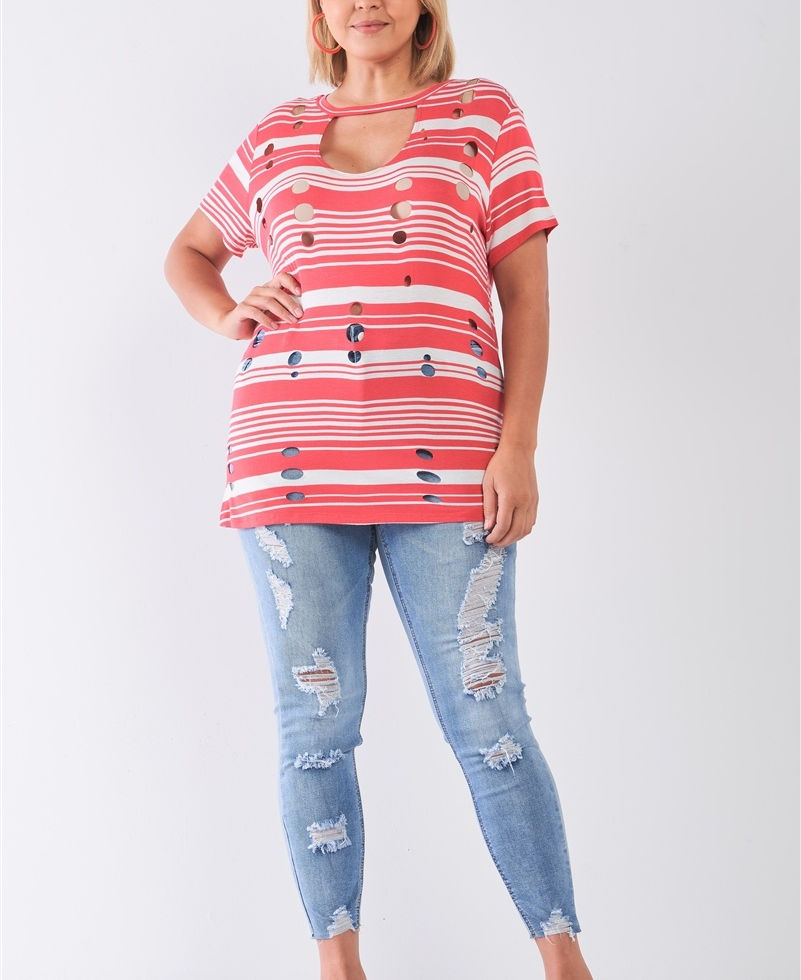 Get ready to make a fashion statement with our Plus Striped and Distressed Cut-out Top in Coral. Add it to your cart now and experience the perfect blend of fashion and comfort!