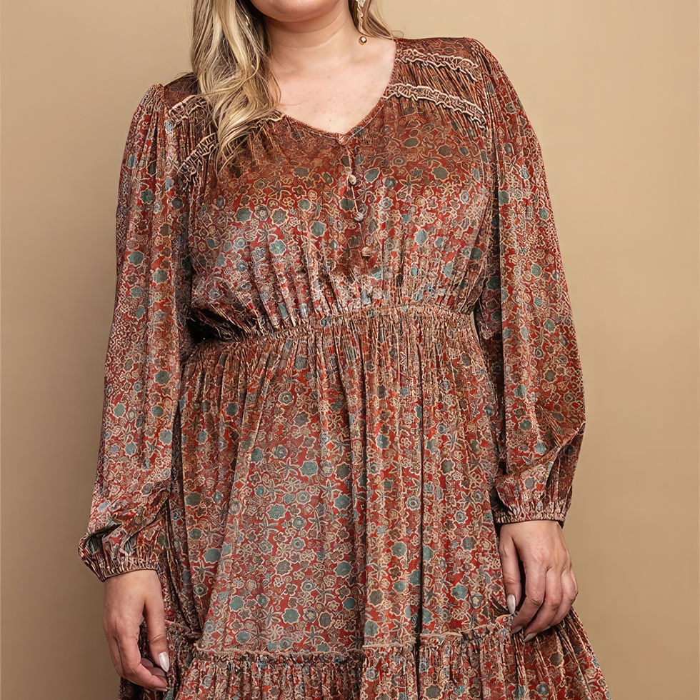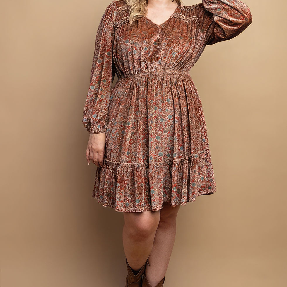 Elevate your style with the Printed Velvet V-Neck Dress with Button Front Detail. Add this exquisite piece to your cart now and embrace the perfect blend of fashion and comfort!