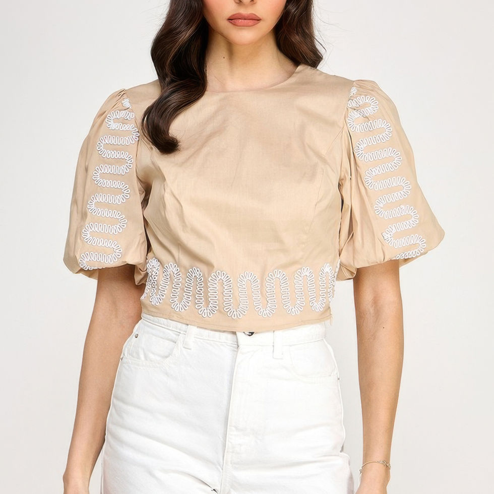 Add a touch of romantic detail to your wardrobe with this puff bubble sleeve top featuring delicate embroidery. Made from 100% cotton, it offers breathable comfort and a lightweight feel, ideal for all-day wear. The voluminous puff sleeves create a bold, feminine silhouette, while the embroidered accents lend a soft, handcrafted finish. Easy to style up or down, this top transitions seamlessly from casual outings to more polished looks. It's a fresh, stylish choice for any season.