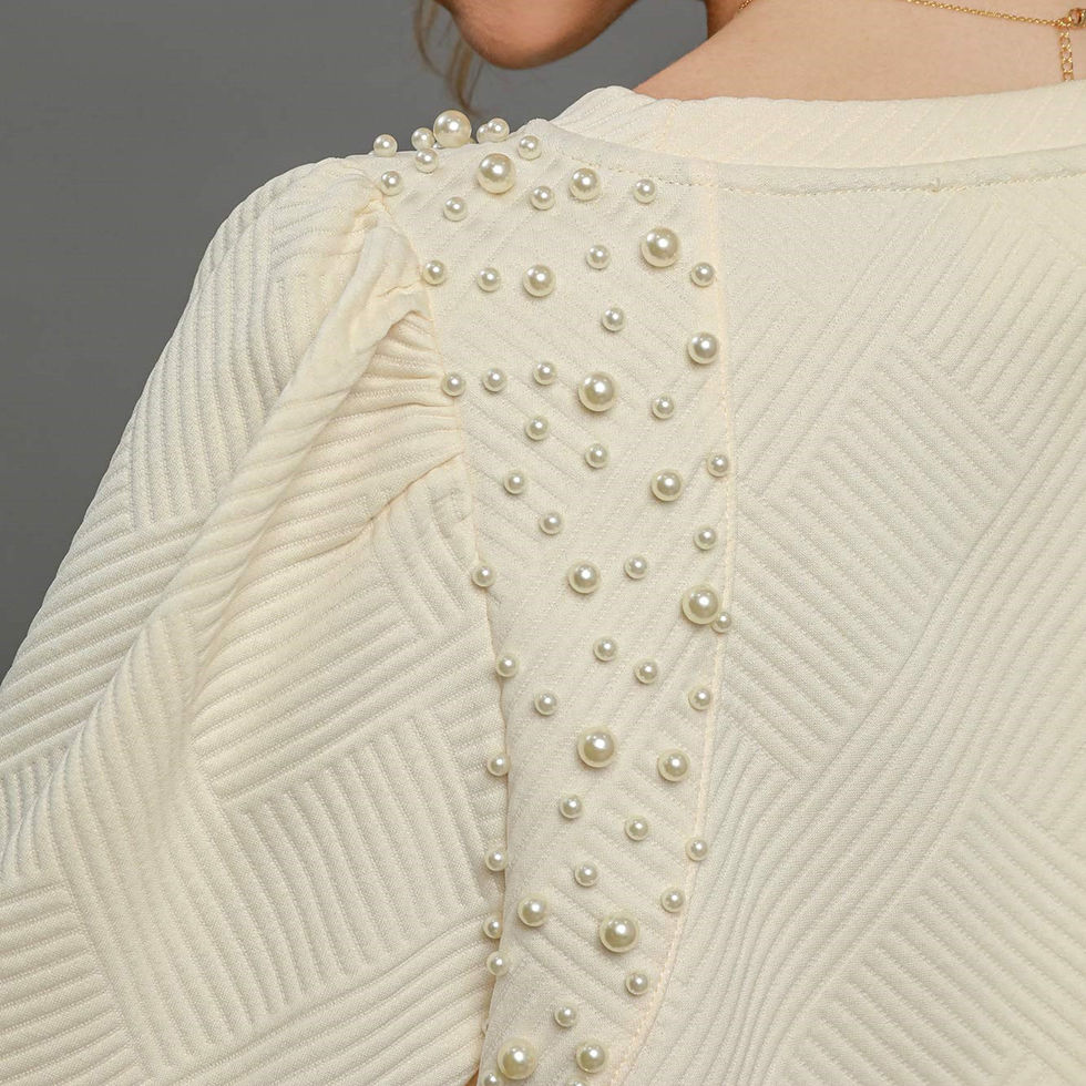 This top combines the elegant puff sleeves and pearl details with the softness and stretch of knit jacquard fabric, making it a versatile and fashionable addition to your wardrobe. Its classic cream color ensures it pairs effortlessly with various outfits.