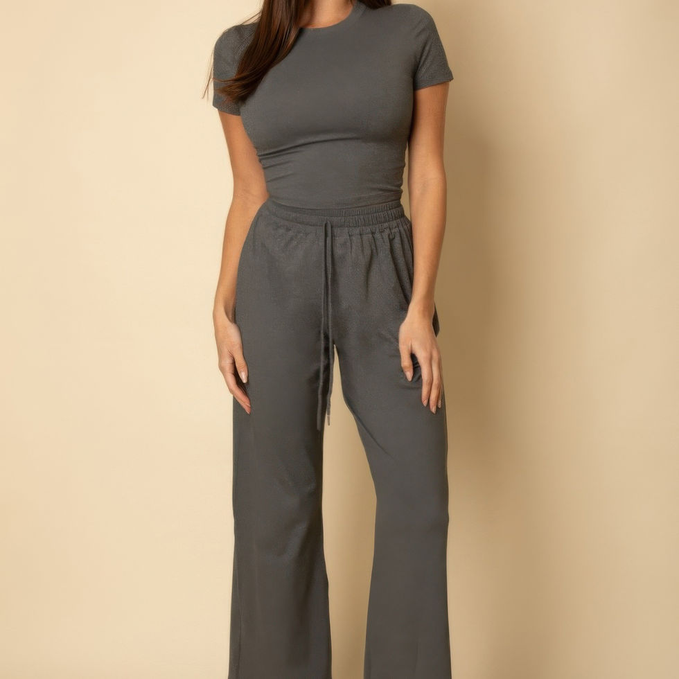 Discover the perfect balance of comfort and style with our Relaxed Fit Top and Wide-Leg Pants Set. The short-sleeve fitted top offers a polished look, while the high-waisted wide-leg pants feature an elastic waistband and decorative drawstring for a relaxed fit. Crafted from soft, breathable fabric, this set is designed for all-day comfort, whether you're lounging at home or out on a casual outing.