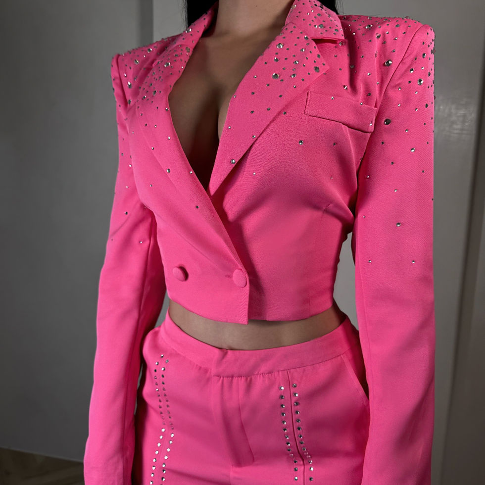 Cropped long sleeve blazer with rhinestone detailing for maximum shine