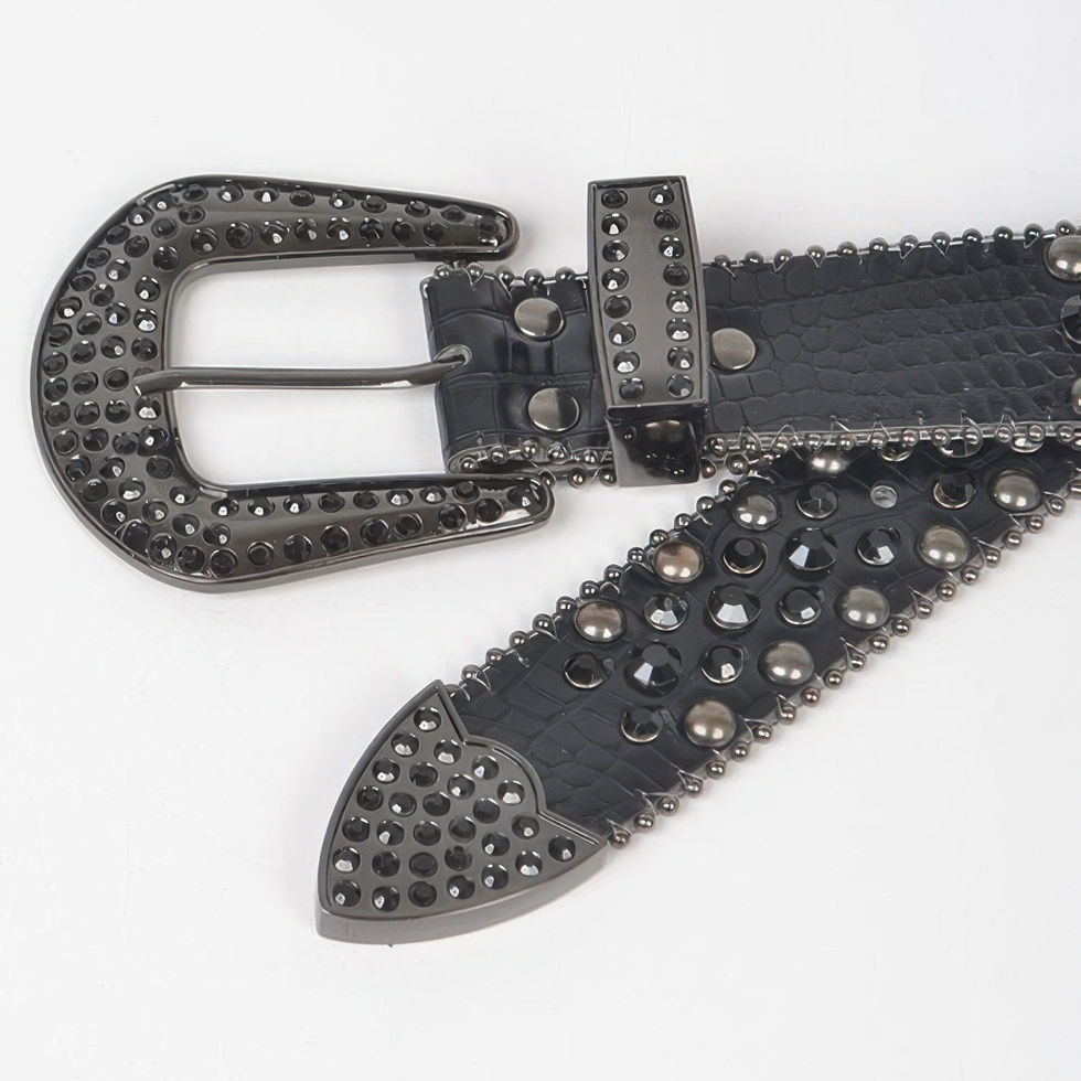 Strike the perfect balance between elegance and edge with the Rhinestone Metal Studded Multi Metal Belt. This versatile black belt features bold black studded details and shimmering rhinestones for a sophisticated yet daring look. Ideal for accentuating your waistline, it adds a polished finish to any ensemble.