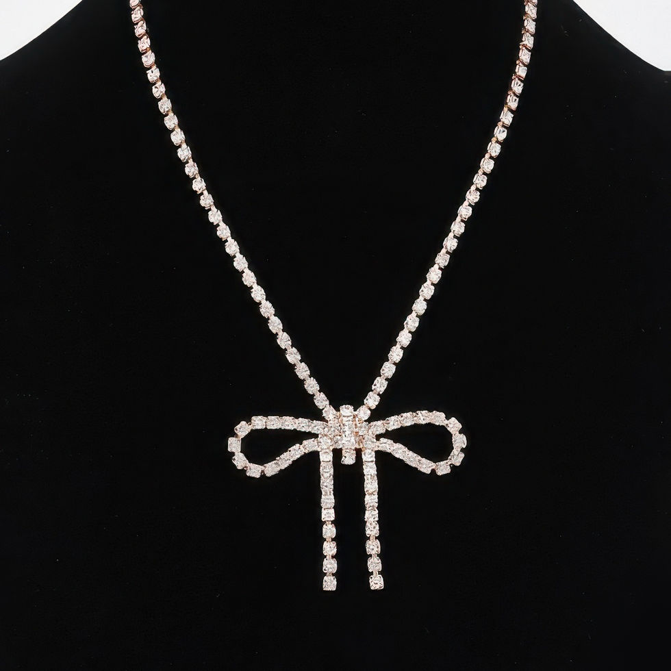 Elegant and eye-catching, the Glamour Bow Necklace is the perfect statement piece for any occasion. Measuring approximately 14" in length, this rhinestone necklace features a radiant bow centerpiece that adds a playful yet polished touch. The intricate rhinestone detailing catches the light beautifully, delivering just the right amount of sparkle to elevate your look. Whether paired with a cocktail dress or layered with eveningwear, this necklace brings timeless glamour to your neckline. Lightweight and designed for comfort, it’s an effortless way to make a sophisticated impression.
