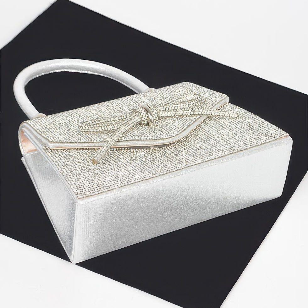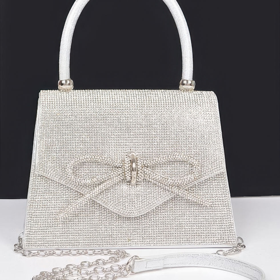 Add a refined touch of glamour to your ensemble with the Midnight Bow Sparkle Bag. This dazzling top handle bag is adorned with allover rhinestones that catch the light beautifully, while a delicate ribbon detail brings a soft, feminine charm. Designed with a structured silhouette and crafted from mixed metal materials, it offers a polished finish that complements both formal and festive occasions. Compact yet eye-catching, this bag is the perfect accessory to complete your evening look with style and sophistication.
