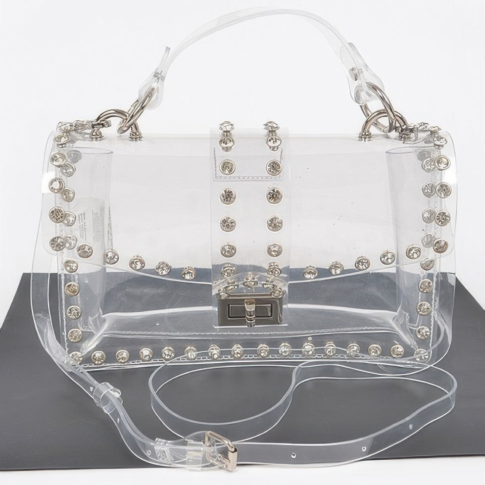 Turn heads with the Rhinestone Studded Transparent Crossbody Bag. This dazzling accessory features a crystal-clear design with rhinestone embellishments that sparkle with every move. The structured silhouette and crossbody strap make it as practical as it is chic. Made from durable PVC with sleek metal accents, it's perfect for events where style matters. Carry your essentials in standout fashion with this statement-making piece.
