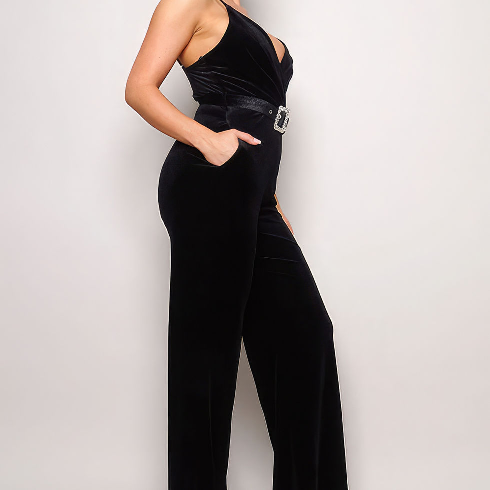 Make a glamorous statement with our Samba Rhinestone Belt Velvet Jumpsuit in black. Add it to your cart now and experience the perfect blend of fashion and comfort!
