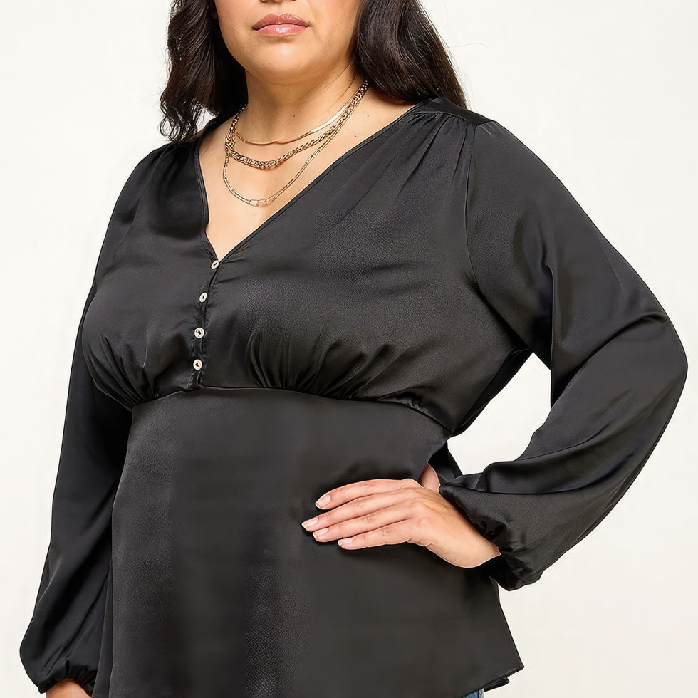 Elevate your style with the Plus Size Satin Babydoll Blouse in Black. Add this elegant piece to your cart now and embrace the perfect fusion of fashion and comfort!
