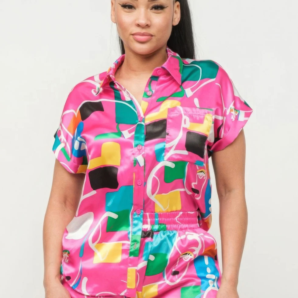 Get ready to turn heads and make a statement with our Satin Dolman Print Button Down Top and Shorts Set. Add it to your cart now and experience the perfect blend of fashion and comfort!