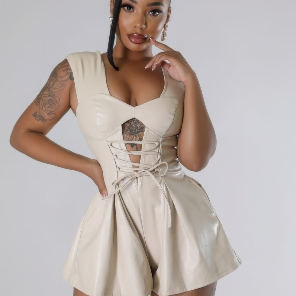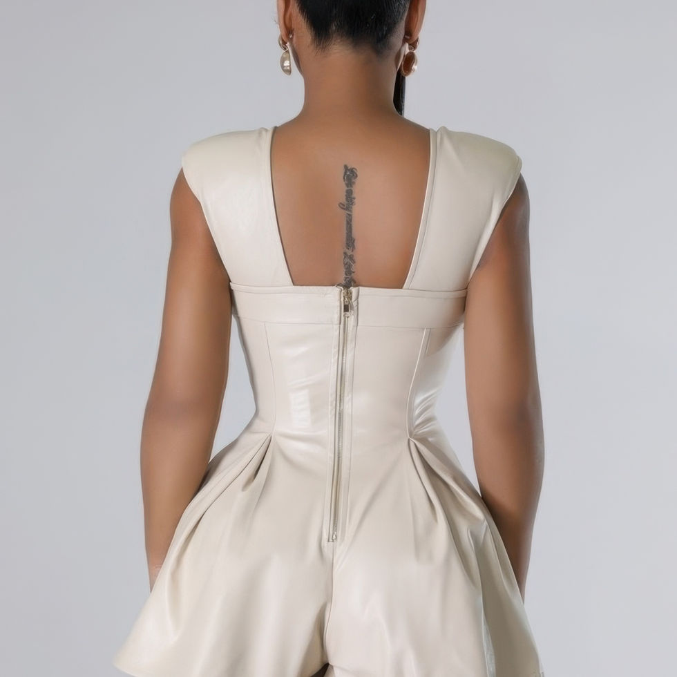 Elevate your wardrobe with our Semi-Stretch Romper in natural faux leather. Experience comfort and style with this versatile ensemble!