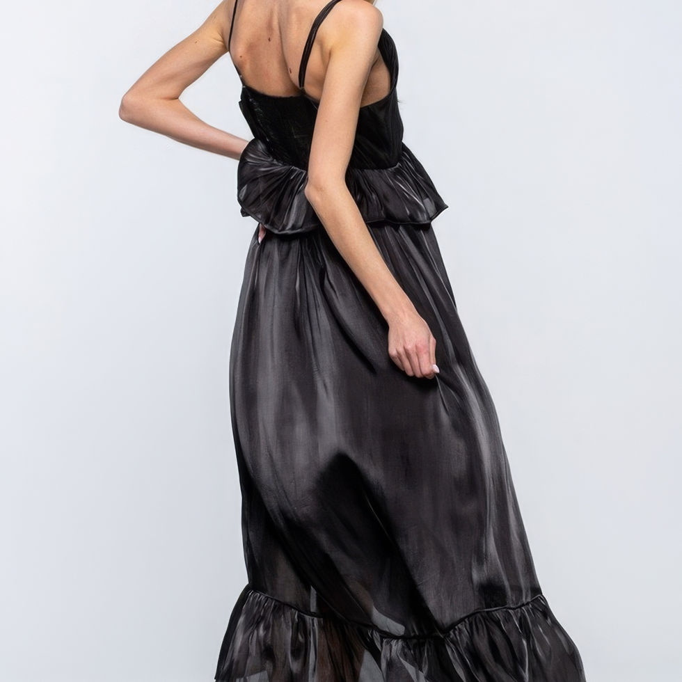 Enhance your wardrobe with our Sleeveless Ruffle Dress in Black. Perfect for making a statement at your next special occasion!