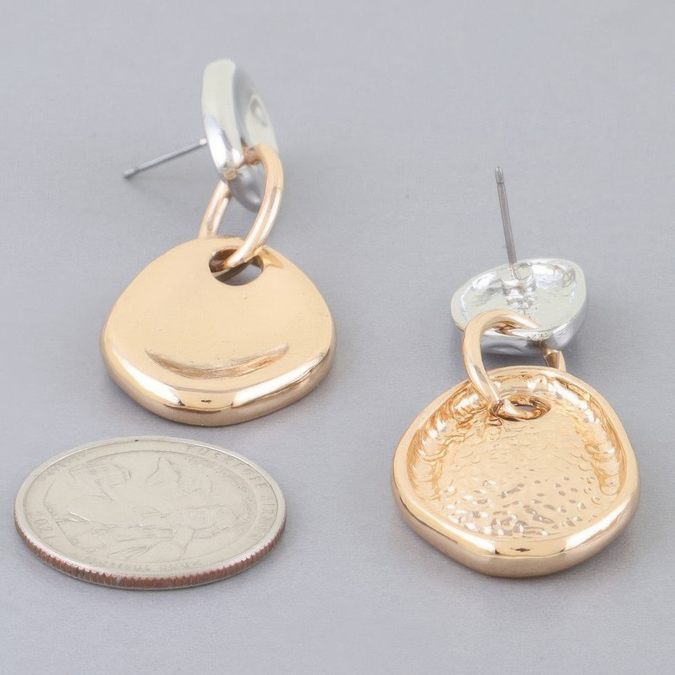 Elevate your accessory game with the Charming Duo Drops—striking two-tone earrings that blend modern shine with playful elegance. Featuring a polished silver-tone post linked to a shiny, asymmetrical gold-tone plate, these drop earrings deliver bold contrast and effortless sophistication. The fluid, organic shapes catch the light beautifully, making them the perfect pair to transition from day to night. Lightweight and full of personality, they’re your go-to for standout style.