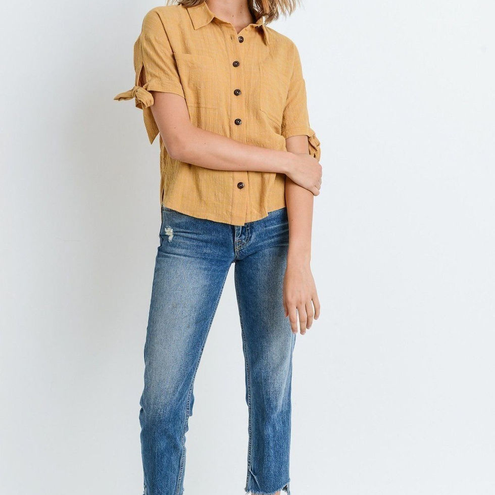 Add the Short Sleeve Button Up Top with Tie Sleeves in Mustard to your cart now and elevate your style with this chic and comfortable piece!