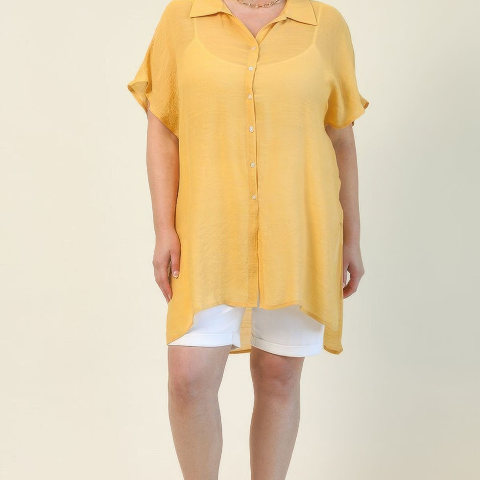 Introducing our Solid Button Down Loose Fit Long Shirt with Side Slits in Honey, a versatile and stylish addition to your wardrobe. Made from a perfect blend of 50% polyester and 50% rayon, this shirt offers a smooth and breathable feel, while its loose fit and side slits provide both comfort and an effortlessly chic silhouette. Whether you're dressing it up for a night out or keeping it casual for everyday wear, this shirt is the perfect go-to piece.