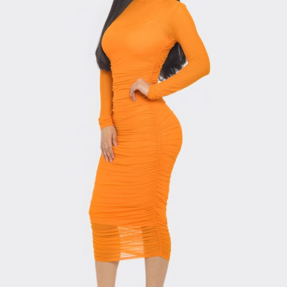 Make a statement with our Solid Mesh Ruched Midi Dress in Orange. Add it to your cart now and elevate your look with timeless elegance!