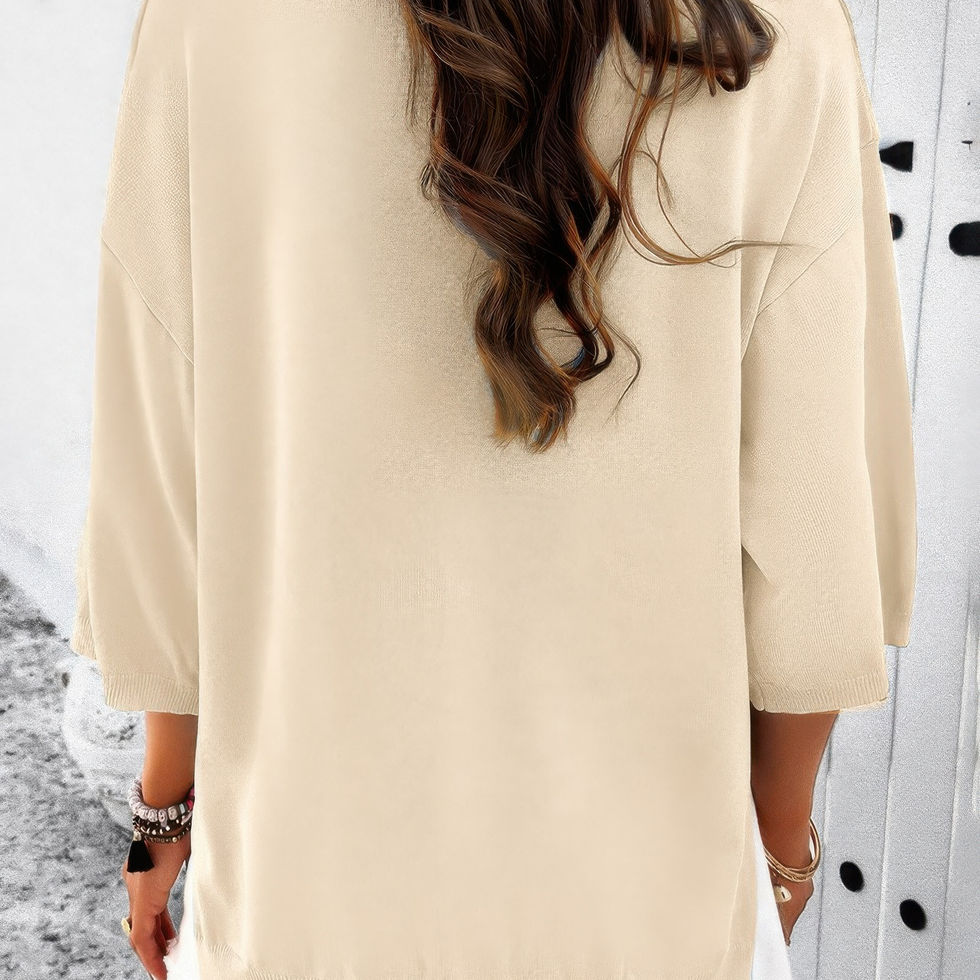 Polished and lightweight, this short sleeve knit sweater blends classic style with modern comfort. Designed with a notched collar and V-neckline, it offers a tailored look while maintaining a relaxed, breathable feel. Made from 100% viscose, the fabric is soft, smooth, and perfect for transitional seasons or layering. Whether worn solo or under a jacket, this versatile piece easily pairs with denim, trousers, or skirts for an elevated everyday outfit. It’s an effortless staple you’ll wear again and again.
