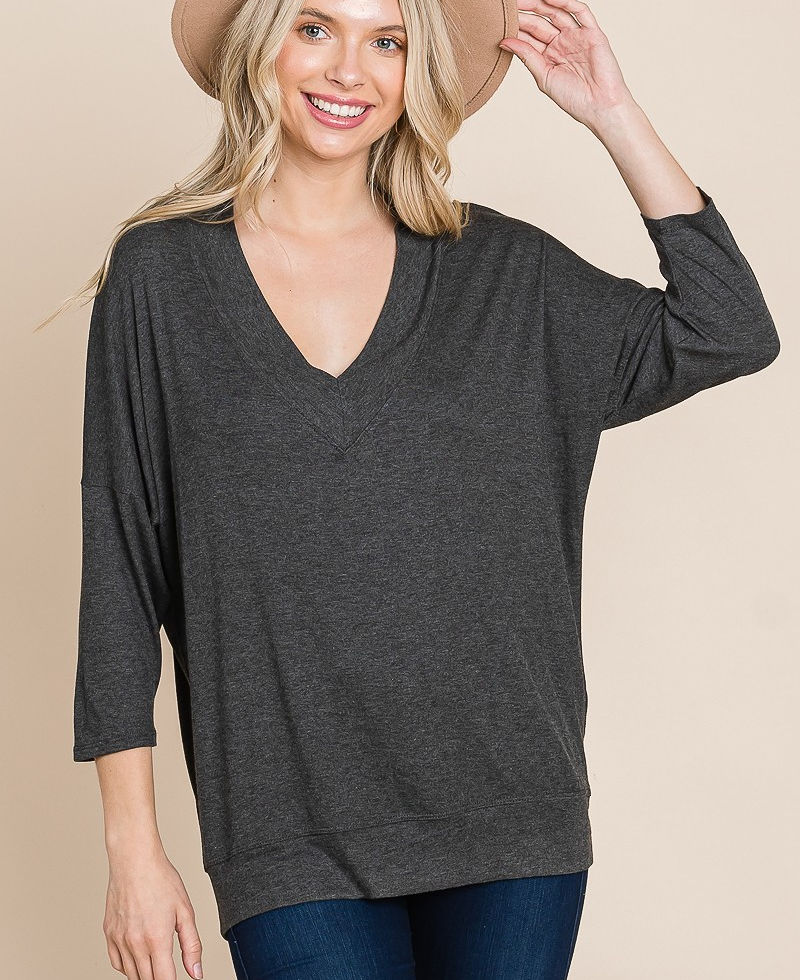 Elevate your casual wardrobe with the Solid Rib Modal Casual 3/4 Sleeves Dolman Sleeves Top in Charcoal. Add it to your cart now for the perfect blend of comfort and style!