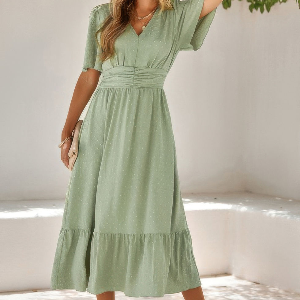 The Solid V Neck Belted Wrap Layered Midi Dress combines chic styling with a relaxed fit for effortless wear. Crafted from 100% Polyester, it offers both comfort and durability. Design details include solid v neck belted wrap layered midi dress, making it a versatile choice for your wardrobe. Perfect for casual/daily/outdoor/vacation/holiday/school/going out.. Pair it with your favorite bottoms for a laid-back look or dress it up with accessories for a more refined vibe. This piece seamlessly transitions from casual to dressy occasions.