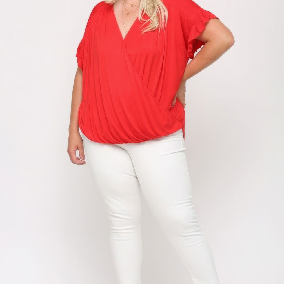 Introducing our Solid Viscose Knit Surplice Top with Ruffle Sleeve—a chic and versatile addition to your wardrobe. This top, available in XL, 1XL, and 2XL, features a solid viscose knit, surplice design, and playful ruffle sleeves for a stylish and feminine look.