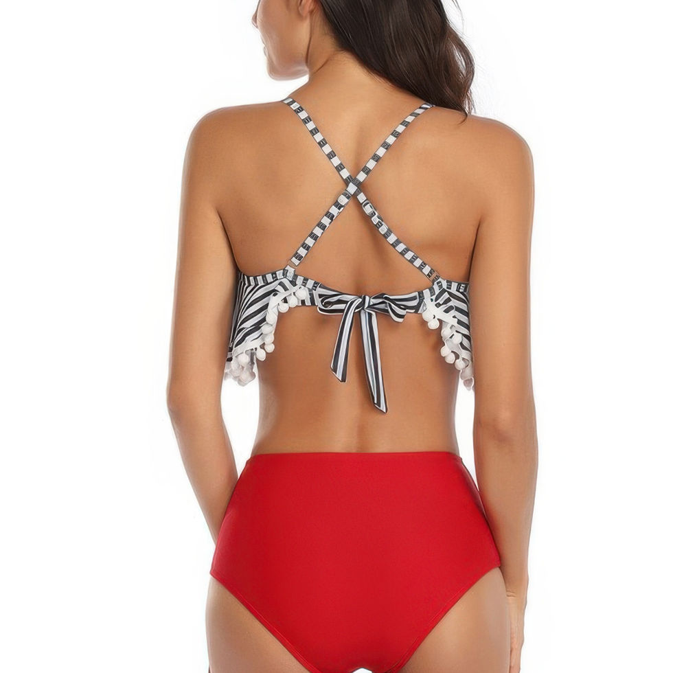 Fresh and playful, this striped bikini set is designed with a flattering high-waisted bottom and charming ruffle details. The sleeveless top offers support and style, while the classic stripes bring a timeless beach-day vibe. Made from a stretchy nylon-spandex blend, this suit ensures comfort and a secure fit for every swim or sunbathing session. A flirty yet functional pick for your next seaside escape.