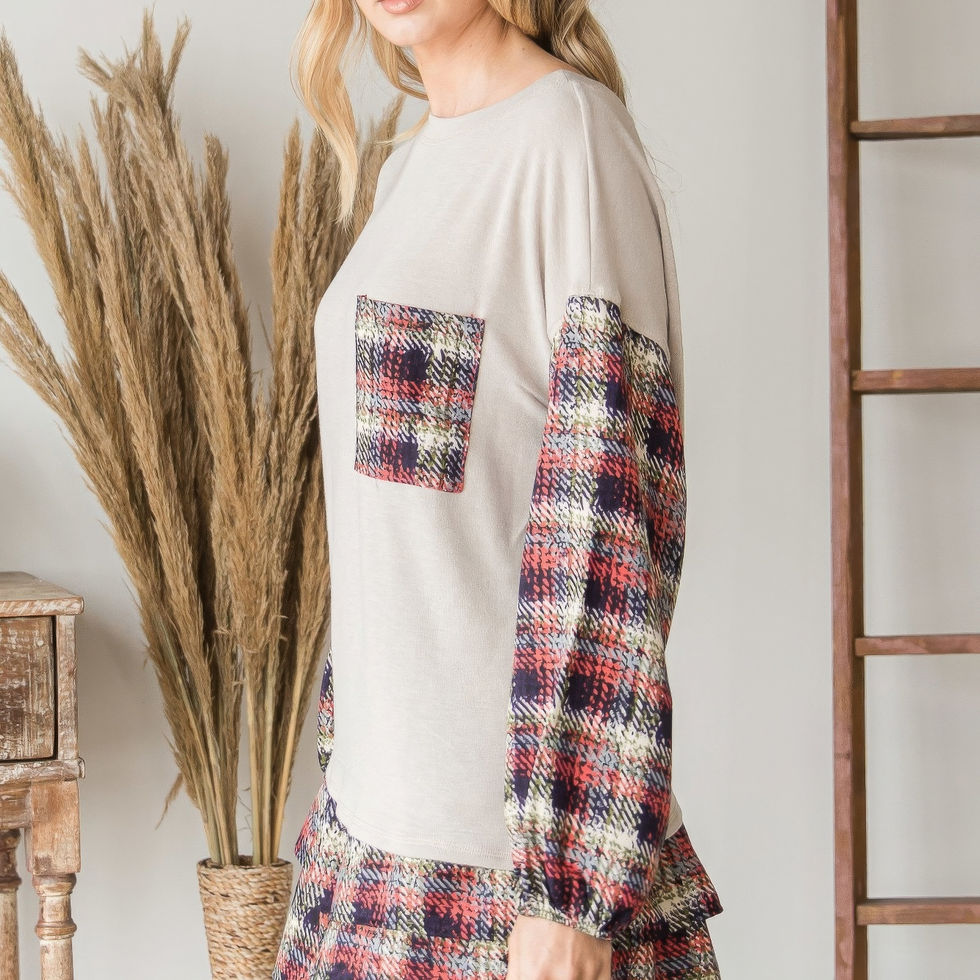 Our top offers the perfect combination of style and comfort, making it a versatile piece for any fashion-forward individual. The cute color block design and vibrant plaid pocket and sleeves add a playful touch, while the soft and stretchy fabric ensures maximum comfort.