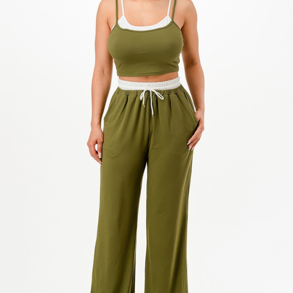 Add the Tank Top and Sweatpant Set in olive to your cart today and enjoy the perfect combination of comfort and style for any casual occasion!
