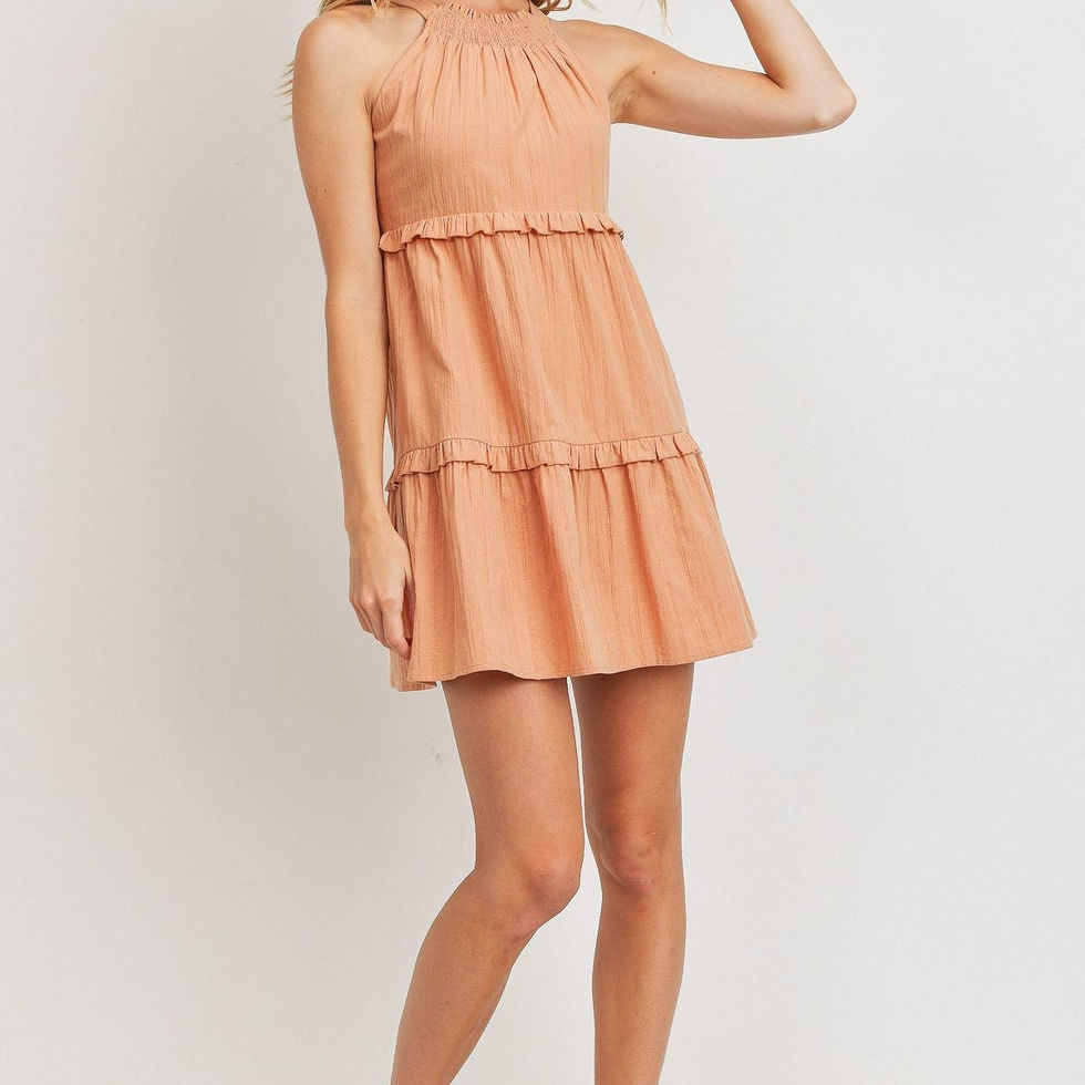 Introducing our Textured Woven Fabric with Tiered Sleeveless Dress—a captivating ensemble that effortlessly combines sophistication with a touch of playfulness. Elevate your wardrobe with this stunning piece, featuring a halter round-neck, a back-keyhole with a charming tie, and a two-tier design with delightful ruffled layers for added flair.