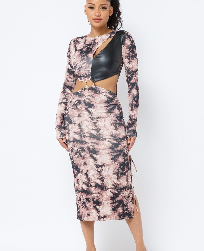Why Choose Tie Dye Long Sleeve Midi Dress with Cut Out and PU Leather Details?