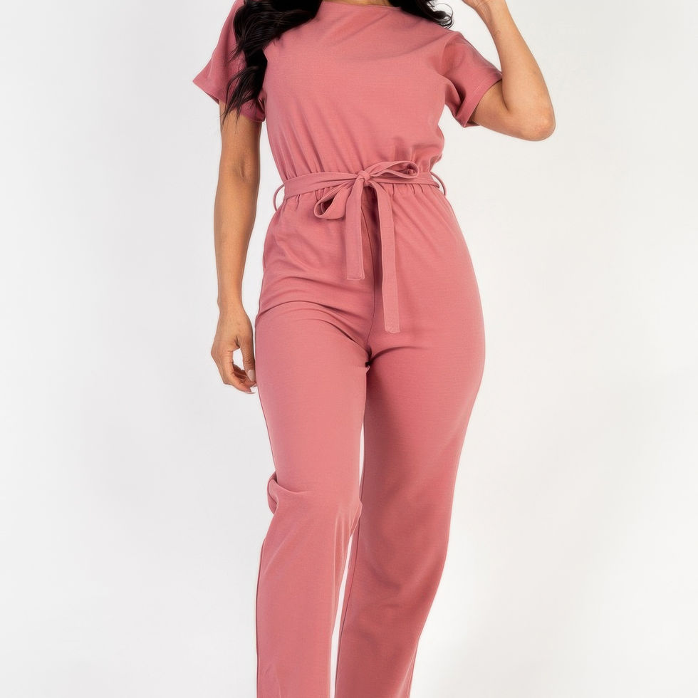 The Tie Waist Relaxed Jumpsuit combines casual chic with effortless comfort. Its relaxed fit, tie waist, and ribbed texture offer a stylish yet laid-back vibe, making it a versatile addition to your wardrobe for a variety of occasions.