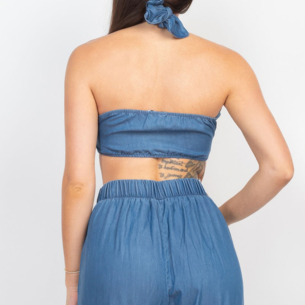 Step up your statement style with this tube tied top and wide-leg pants set, crafted from soft woven denim with a sleek finish. The cropped tube top features a twistable halter design and self-tie back, giving you a bold, customizable fit with standout appeal. Paired with full-length high-waisted pants, the look comes together with relaxed elegance. The pleated front adds refined detail, while the elastic waistband ensures comfort all day long. Finished with a wide-leg cut for ease and movement, this set blends edgy and effortless in one go-to outfit.