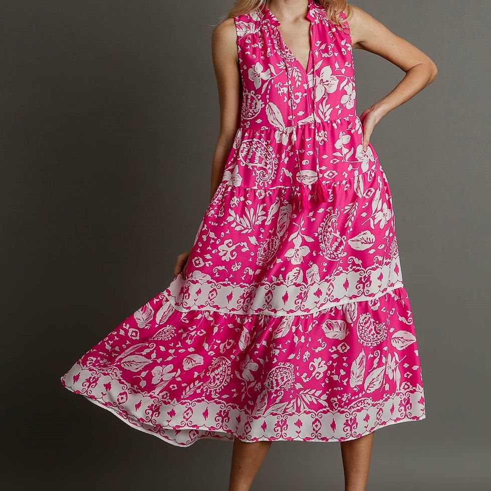 Introducing our Two Tone Floral Paisley Sleeveless Midi Dress with Tassel Front Tie, a delightful and versatile addition to your wardrobe, now available in the lovely Pink hue. Crafted from 100% rayon, this dress offers both style and comfort, perfect for any occasion.