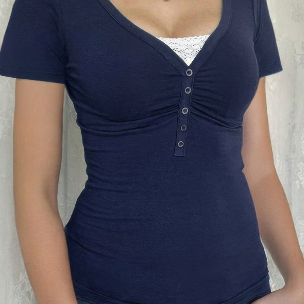 Bring timeless elegance to your everyday look with this V Neck Solid Lace Splicing Button Fitted Shirt. Made from a soft viscose-elastane blend, this shirt features delicate lace detailing along the neckline and a flattering fitted silhouette. The button-down design makes it easy to style for both casual and dressed-up occasions, offering versatility and charm for every setting.