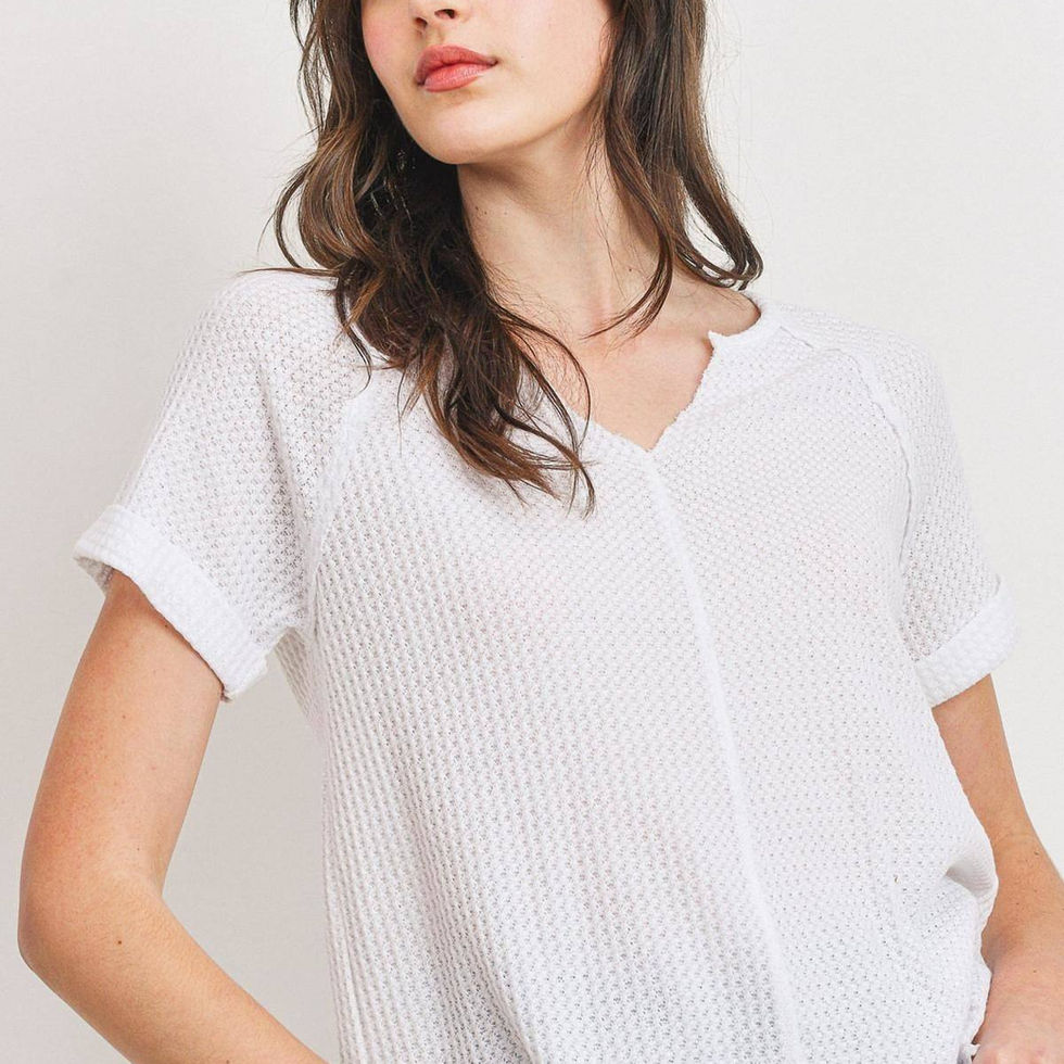Upgrade your casual wardrobe with our Waffle Raw Edge V-neck Rolled Up Short Sleeves Top in Marshmallow. Add it to your cart now and experience the perfect blend of comfort and laid-back style!